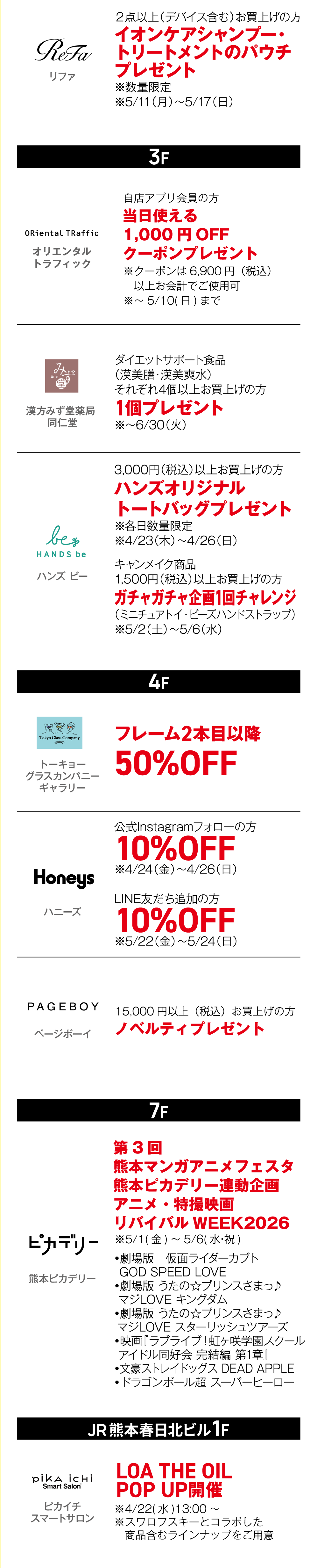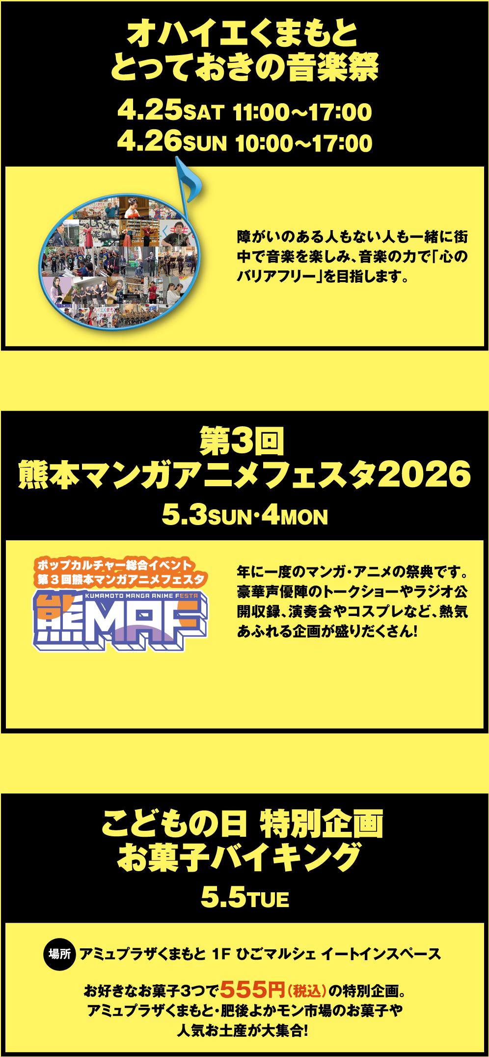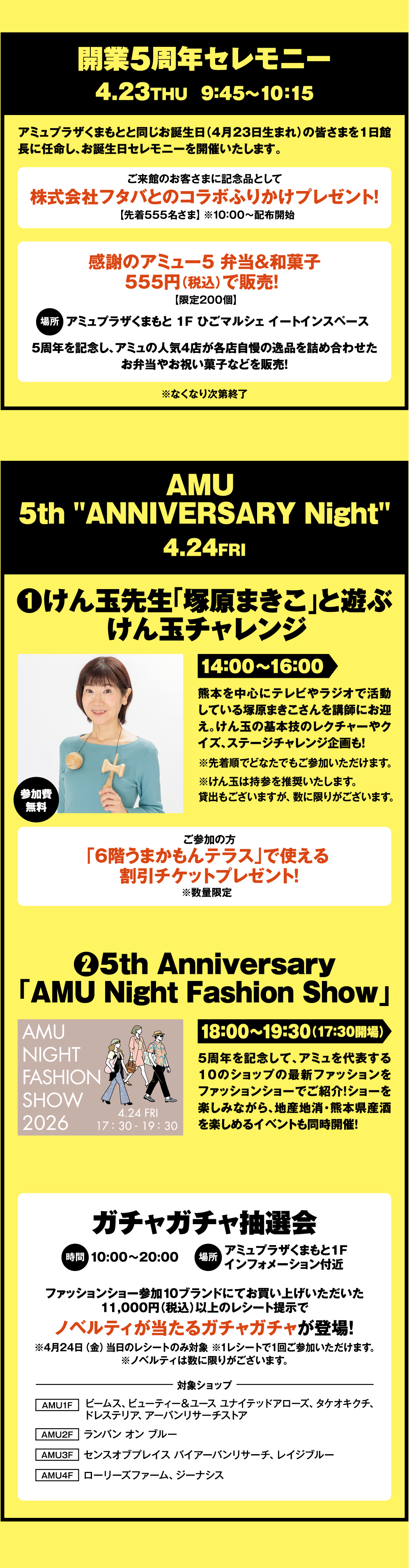 アミュプラザくまもとは、4月23日で開業5周年を迎えます。感謝の気持ちを込めてーーーいつもよりもっとお得なプレミアムデイズと楽しいイベントをお届けします。これからもココロ踊る冒険のひとときを、アミュプラザくまもとで。