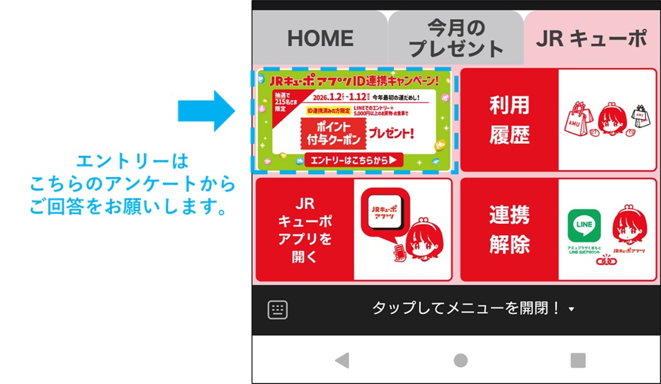 ①2026年1月12日23:59までに、JRキューポアプリとアミュプラザくまもとLINE公式アカウントのID連携が済んでいる