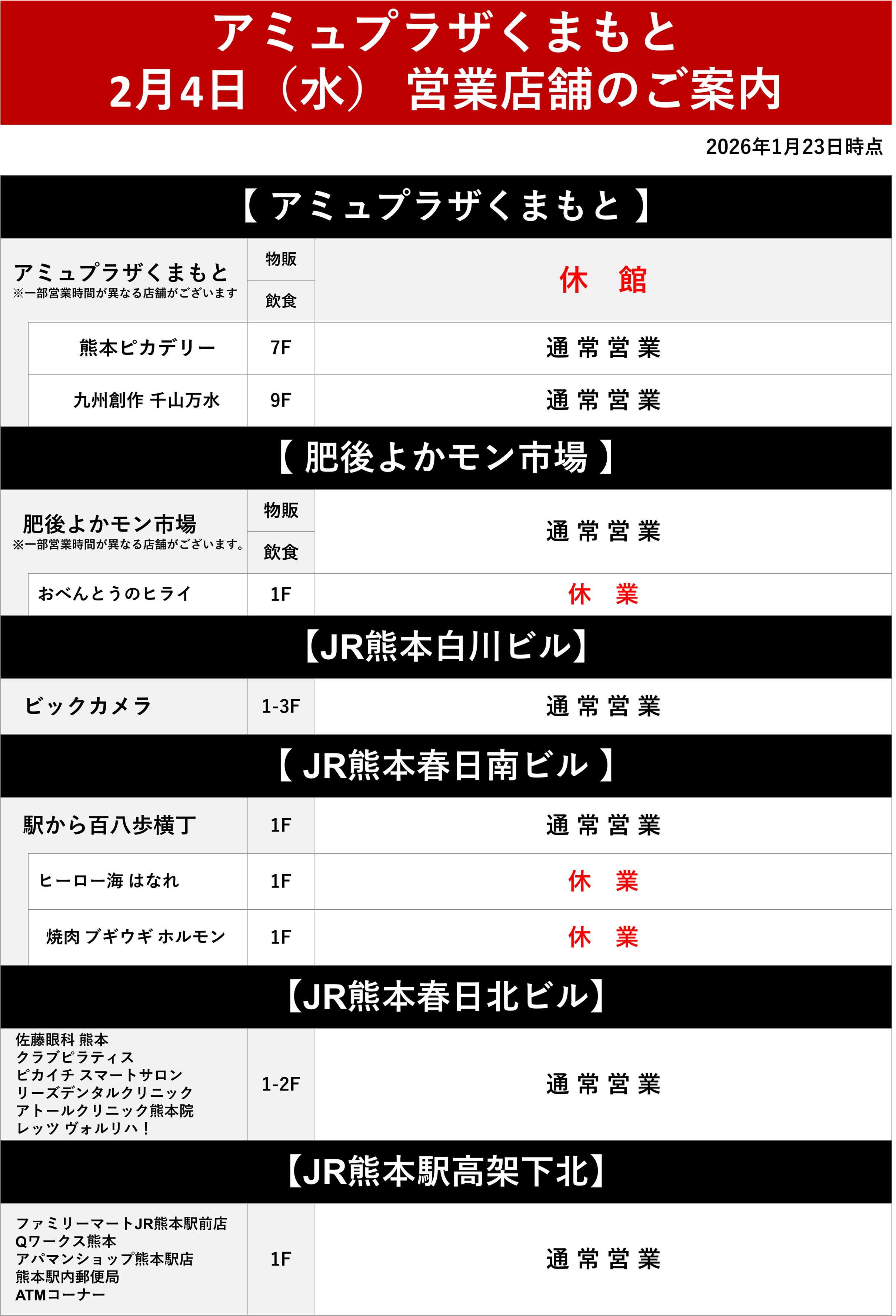「アミュプラザくまもと」は一部店舗を除き、休館とさせていただきます。